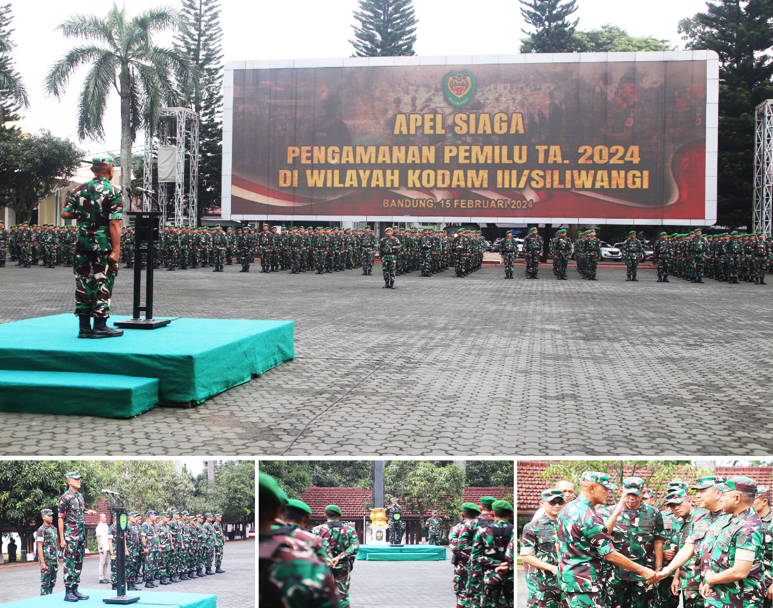 destinasianews – Pangdam III/Siliwangi Mayjen TNI Erwin Djatniko memimpin Apel Siaga Pengamanan Pemilu TA. 2024 di Wilayah Kodam III/Slw bertempat di Lapangan Makodam III/Slw Jl. Aceh No. 69 Kota Bandung, Kamis (15/02/2024).