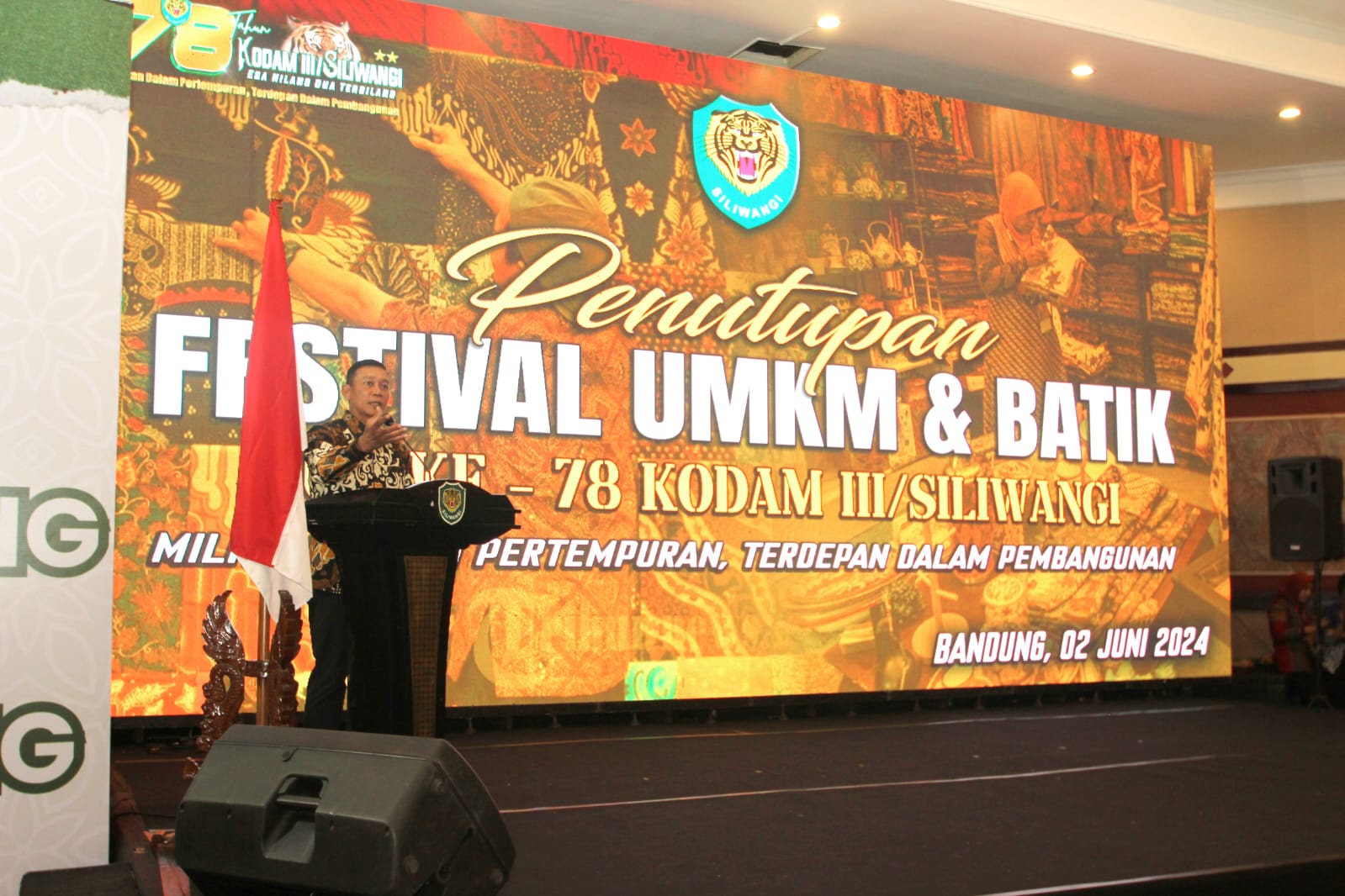 destinasiaNews – Pangdam III/Siliwangi Mayjen TNI Mohammad Fadjar, MPICT., didampingi Ketua Persit Kartika Chandra Kirana Daerah III/Slw Ny. Ira M. Fadjar menutup Festival UMKM dan Batik dalam rangka HUT ke-78 Kodam III/Slw di Graha Manggala Siliwangi Jln. Aceh No. 66 Kota Bandung, Minggu (02/06/2024).