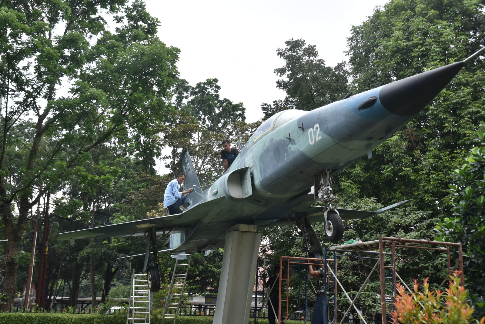 Dalam kegiatan bersih-bersih dan pengecatan ulang Tugu Pesawat F-5, Lanud Husein Sastranegara bekerjasama dengan Sathar 12 Depohar 10 Lanud Husein Sastranegara. (HRS/Rls/dtn)