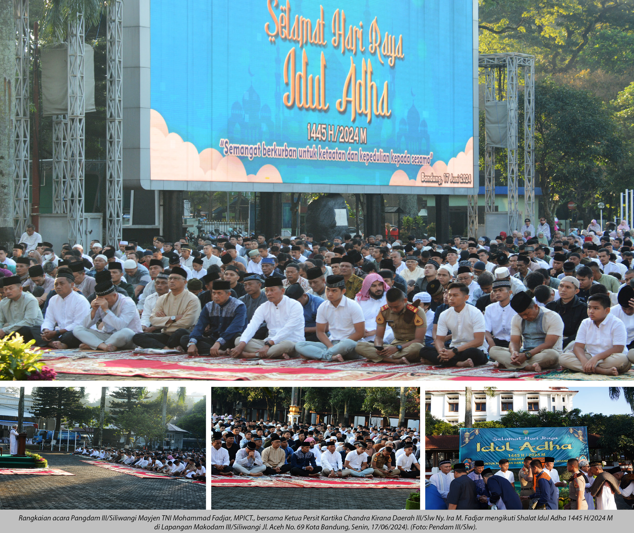 destinasiaNews – Pangdam III/Siliwangi Mayjen TNI Mohammad Fadjar, MPICT., bersama Ketua Persit Kartika Chandra Kirana Daerah III/Slw Ny. Ira M. Fadjar mengikuti Shalat Idul Adha 1445 H/2024 M di Lapangan Makodam III/Siliwangi Jl. Aceh No. 69 Kota Bandung, Senin (17/06/2024).