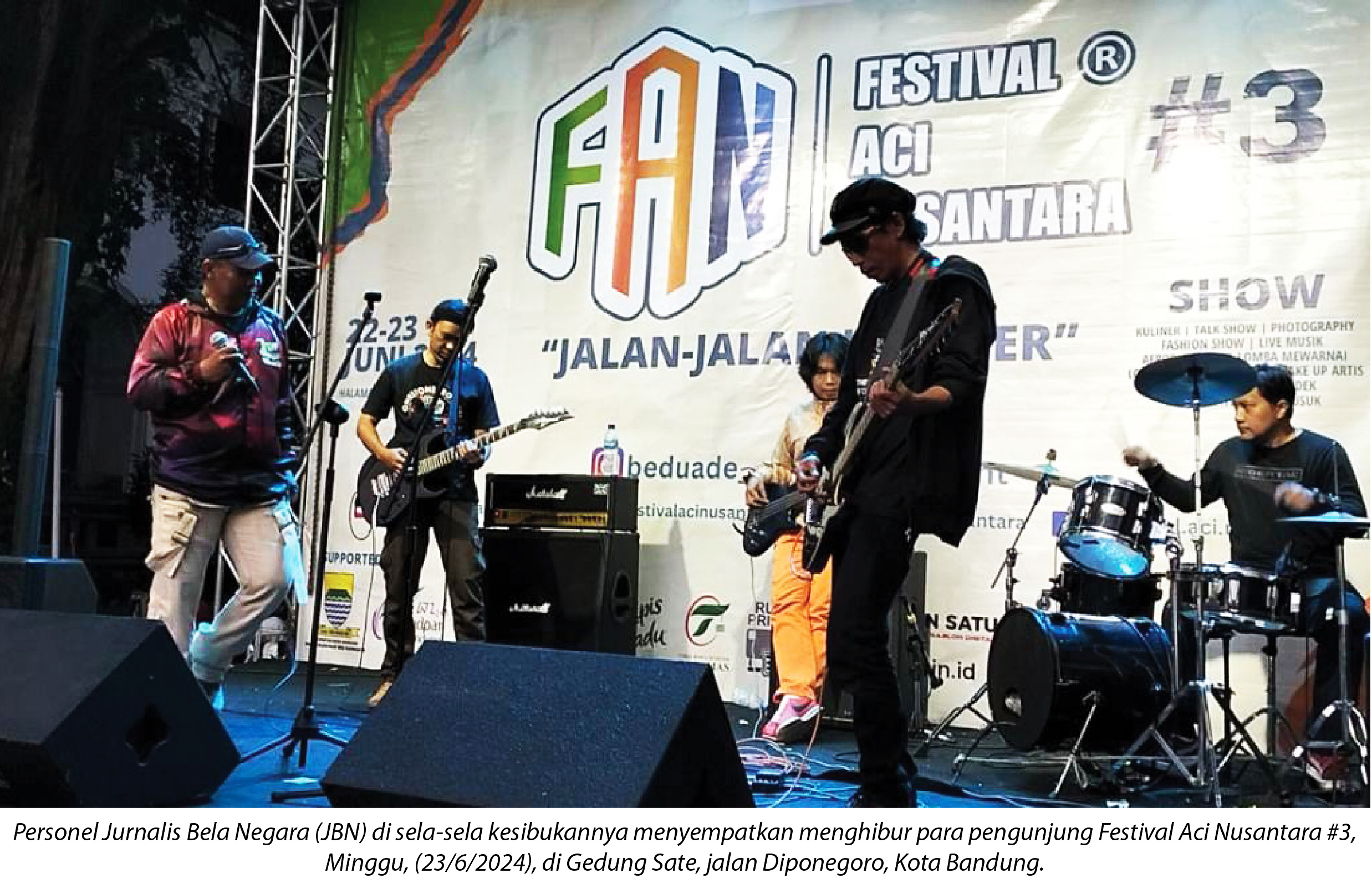 destinasiaNews – Para personel Jurnalis Bela Negara (JBN) di sela-sela kesibukannya menyempatkan menghibur para pengunjung Festival Aci Nusantara #3, Minggu, (23/6/2024), di Gedung Sate, jalan Diponegoro, Kota Bandung.