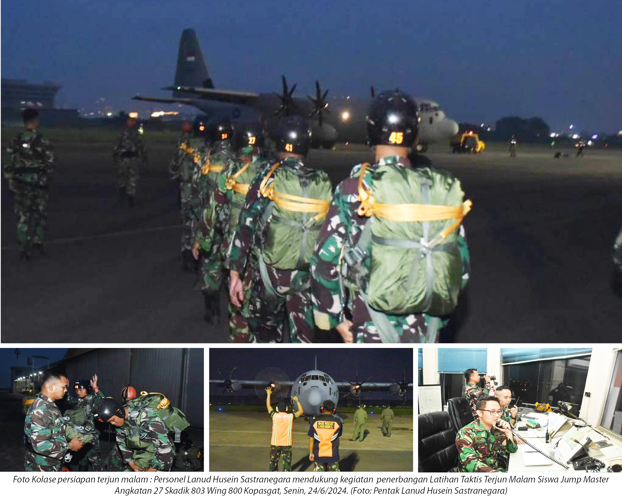 destinasiaNews – Personel Lanud Husein Sastranegara mendukung kegiatan penerbangan Latihan Taktis Terjun Malam Siswa Jump Master Angkatan 27 Skadik 803 Wing 800 Kopasgat, Senin(24/6/2024).
