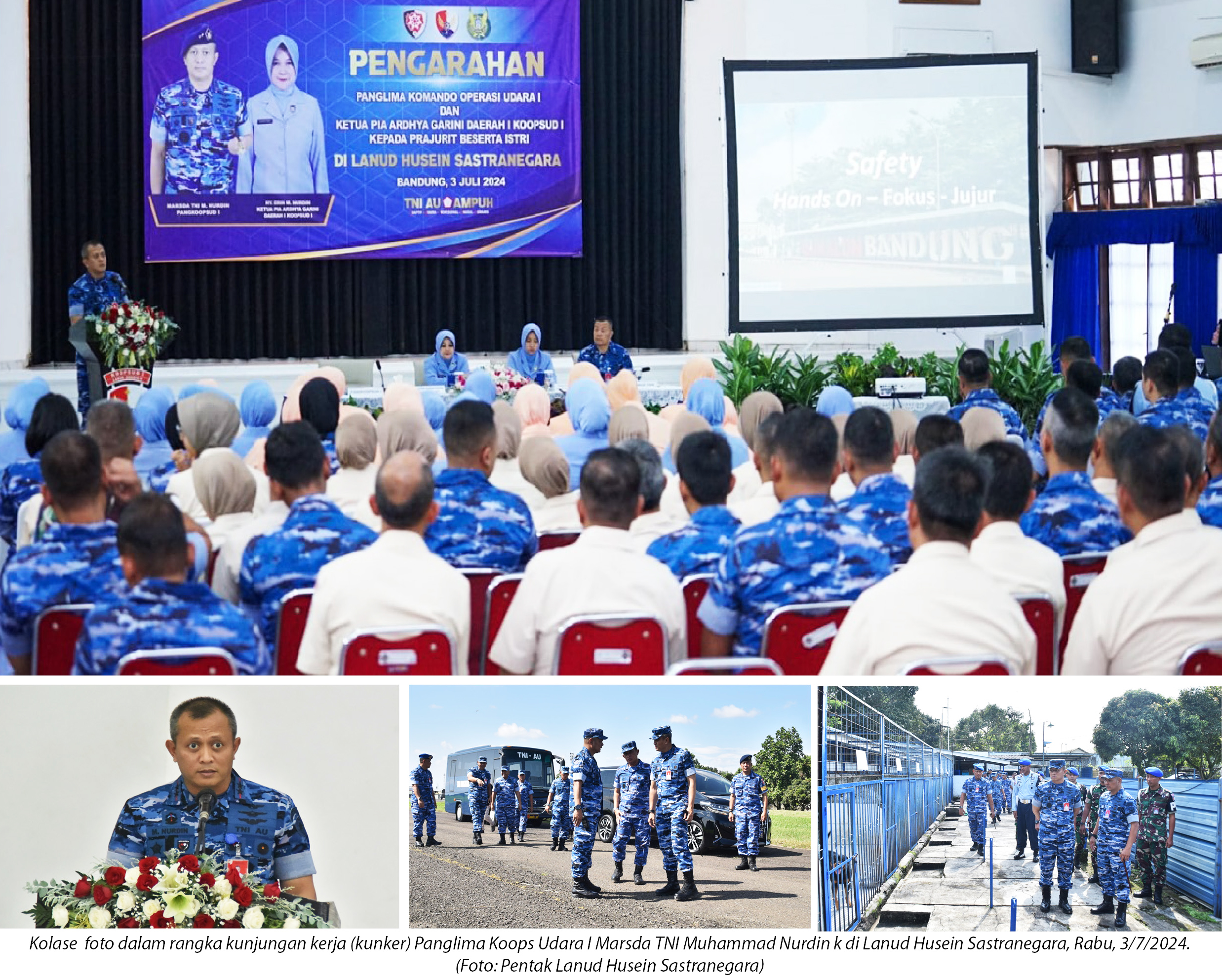 destinasiaNews – Komandan Lanud Husein Sastranegara Kolonel Pnb Alfian, S.E., didampingi Ketua Pia Ardhya Garini Cabang 4/Daerah I Lanud Husein Sastranegara Ny. Annisa Alfian, menyambut kedatangan Panglima Koops Udara I Marsda TNI Muhammad Nurdin dalam kunjungan kerja (Kuker) di Lanud Husein Sastranegara, Rabu (3/7/2024).