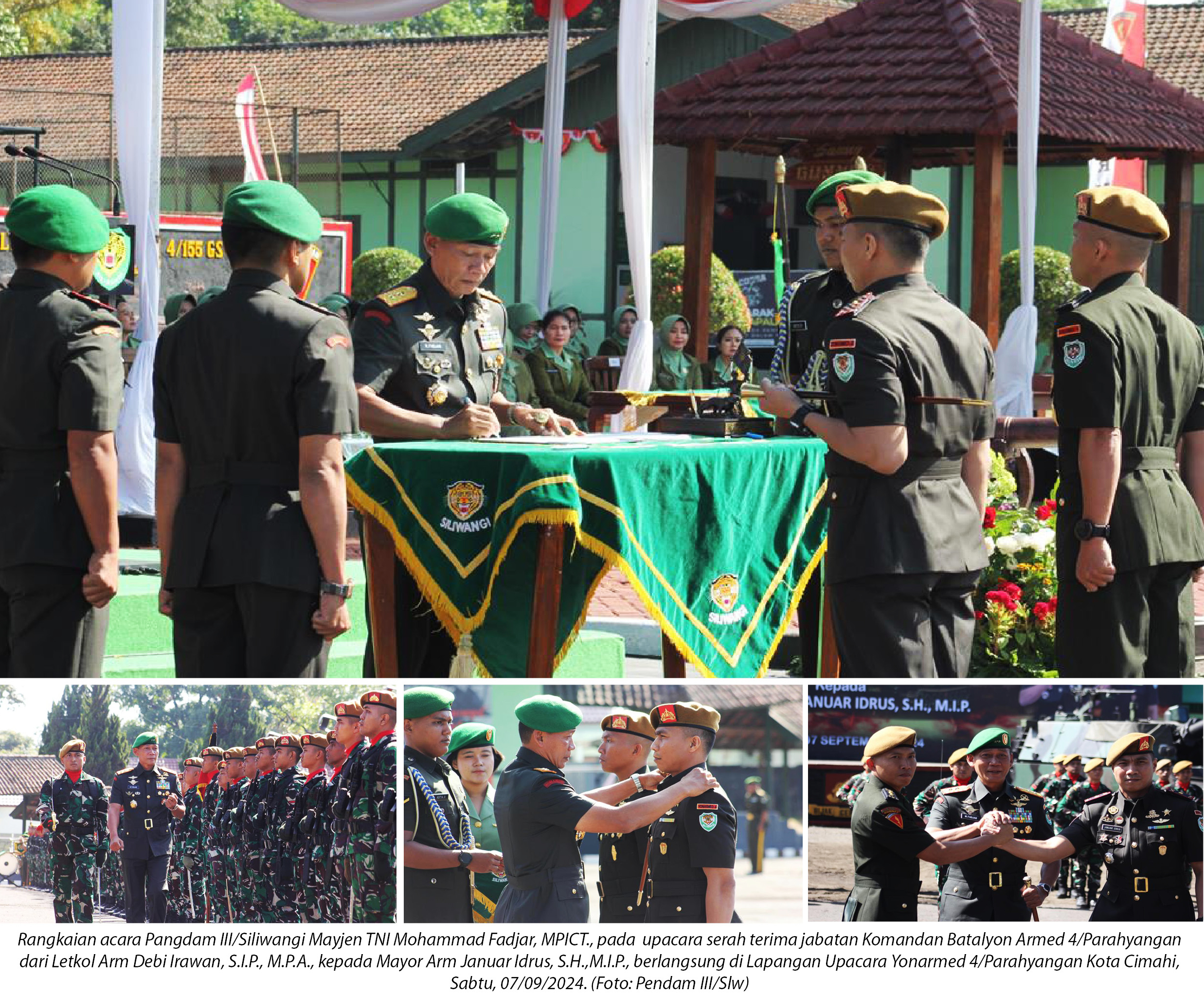 destinasiaNews – Pangdam III/Siliwangi Mayjen TNI Mohammad Fadjar, MPICT., memimpin upacara serah terima jabatan Komandan Batalyon Armed 4/Parahyangan dari Letkol Arm Debi Irawan, S.I.P., M.P.A., kepada Mayor Arm Januar Idrus, S.H.,M.I.P., di Lapangan Upacara Yonarmed 4/Parahyangan Kota Cimahi, Sabtu (07/09/2024).