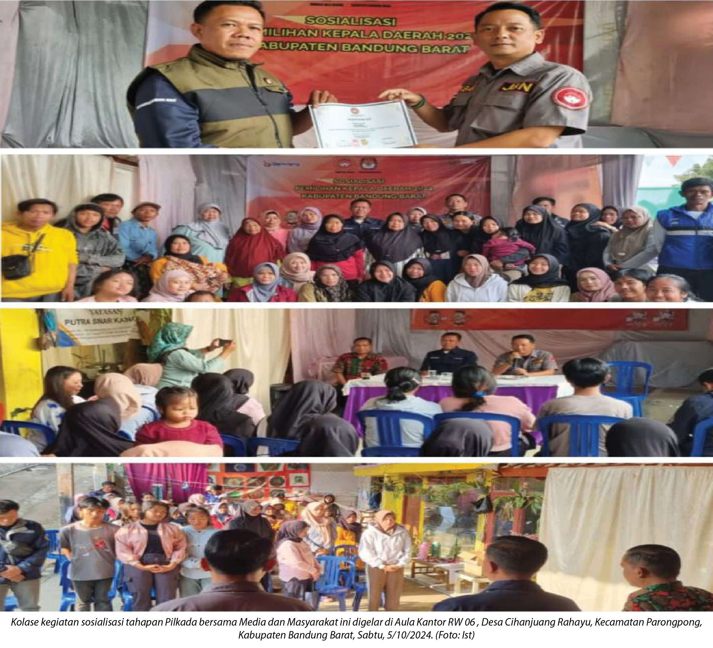 Kegiatan Sosialisasi tahapan Pilkada bersama Media dan Masyarakat ini digelar di Aula Kantor RW 06 Desa Cihanjuang Rahayu Kecamatan Parongpong, Kabupaten Bandung Barat, Sabtu (5/10/2024).