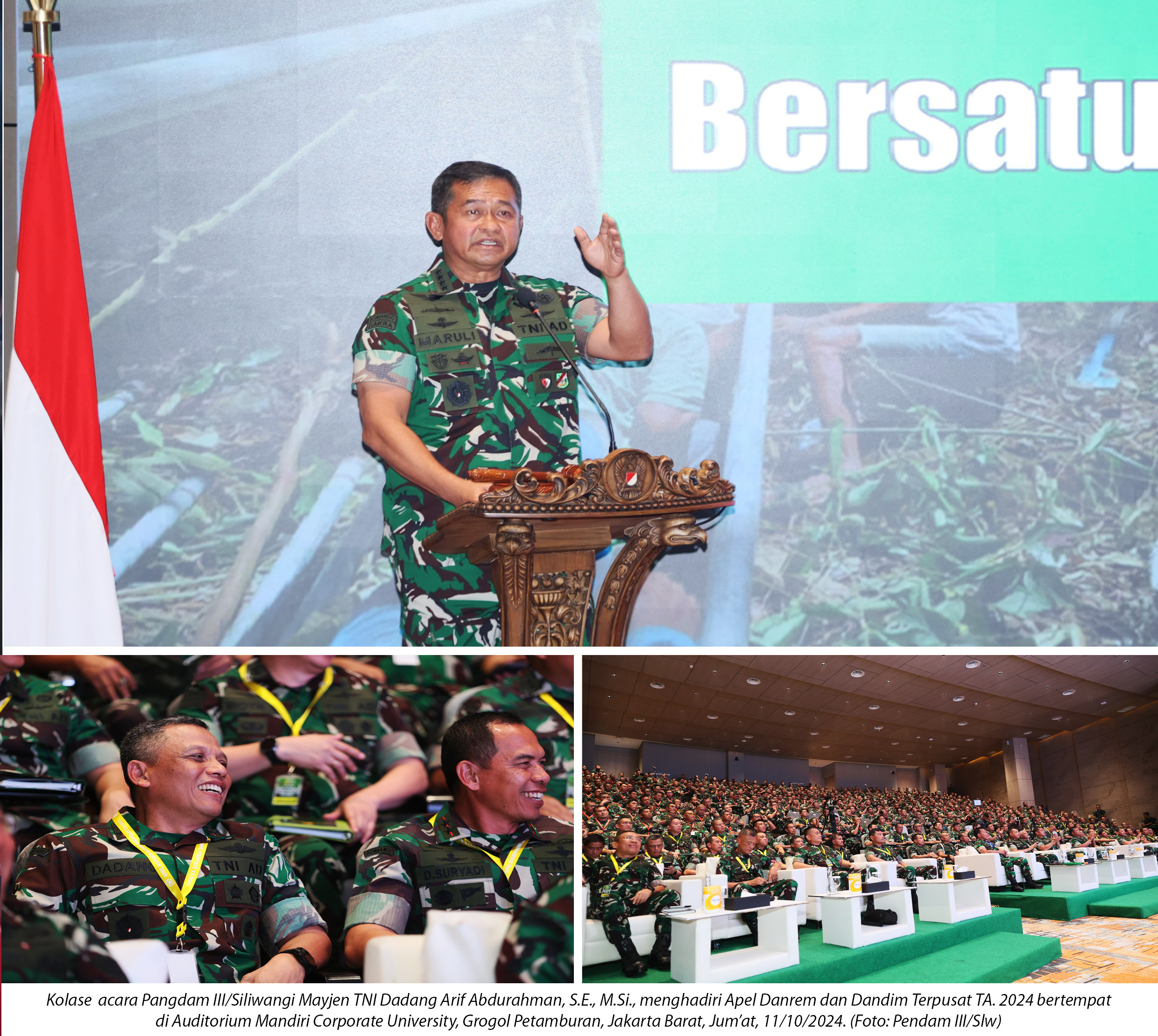 destinasiaNews – Pangdam III/Siliwangi Mayjen TNI Dadang Arif Abdurahman, S.E., M.Si., menghadiri Apel Danrem dan Dandim Terpusat TA. 2024 bertempat di Auditorium Mandiri Corporate University, Grogol Petamburan, Jakarta Barat, Jum’at, 11/10/2024.