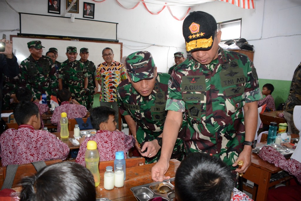 destinasiaNews – Panglima TNI, Jenderal TNI Agus Subiyanto, S.E., M.Si., didampingi Pangkostrad, Pangdam III/Siliwangi, Para Asisten Panglima TNI, Danpuspom, Kapuskes dan Kapuspen TNI meninjau pelaksanaan program Makan Bergizi Gratis (MBG) di SD Negeri Pasir Kaliki Mandiri 2, Kota Cimahi, Kamis (06/02/2025).