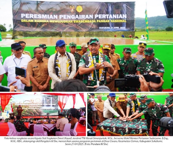 destinasiaNews – Kepala Staf Angkatan Darat (Kasad) Jenderal TNI Maruli Simanjuntak, M.Sc., bersama Wakil Menteri Pertanian Sudaryono, B.Eng., M.M., MBA., didampingi oleh Pangdam III/Slw, meresmikan sarana pengairan pertanian di Desa Ciwaru, Kecamatan Ciemas, Kabupaten Sukabumi, Senin 21/04/2025).