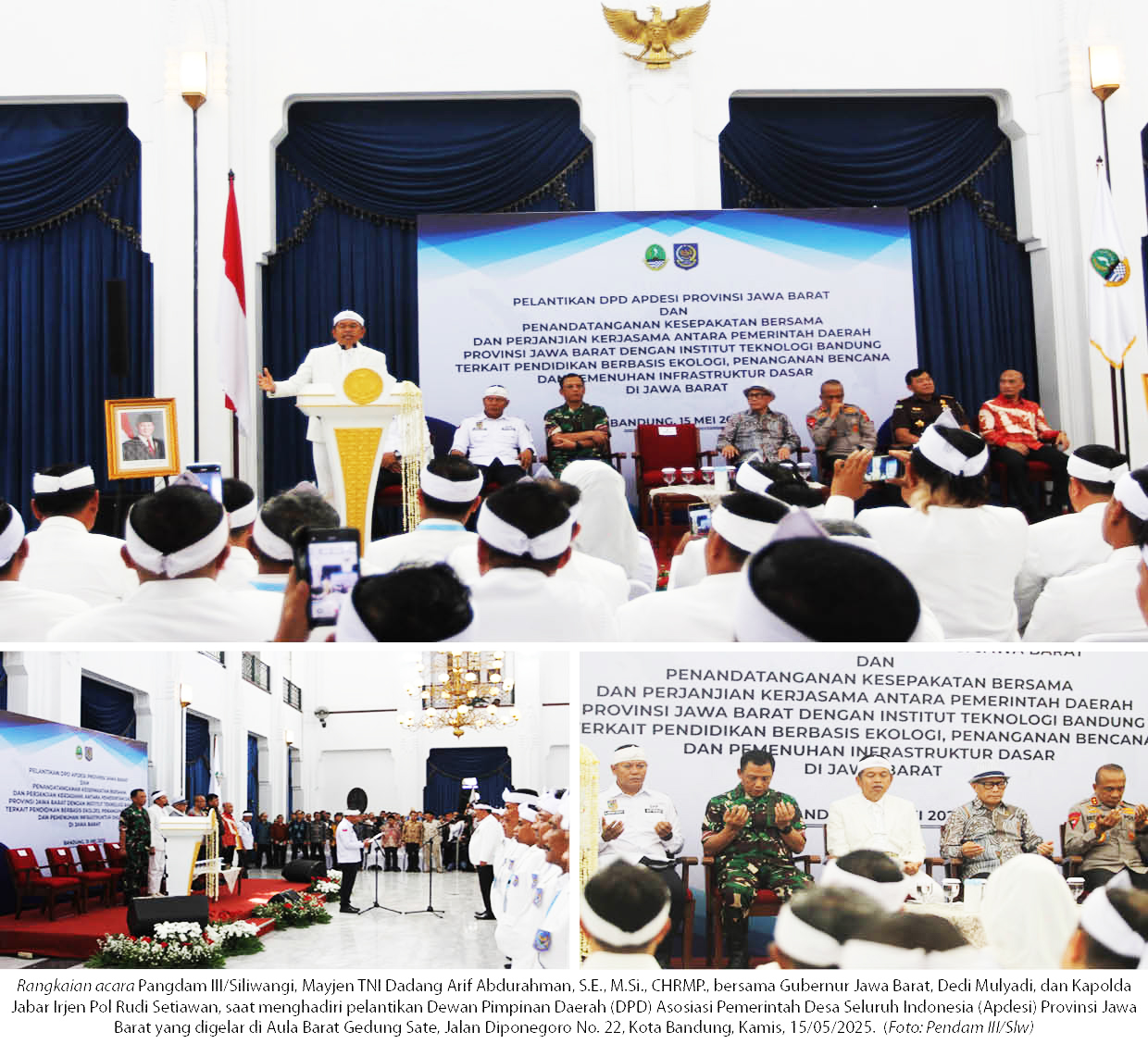 destinasiaNews – Pangdam III/Siliwangi, Mayjen TNI Dadang Arif Abdurahman, S.E., M.Si., CHRMP., bersama Gubernur Jawa Barat, Dedi Mulyadi, dan Kapolda Jabar Irjen Pol Rudi Setiawan, menghadiri acara pelantikan Dewan Pimpinan Daerah (DPD) Asosiasi Pemerintah Desa Seluruh Indonesia (Apdesi) Provinsi Jawa Barat yang digelar di Aula Barat Gedung Sate, Jalan Diponegoro No. 22, Kota Bandung, Kamis (15/05/2025).