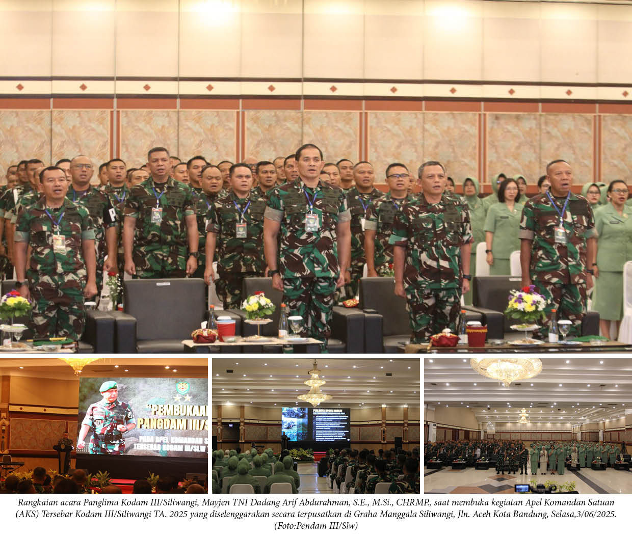 destinasiaNews – Panglima Kodam III/Siliwangi, Mayjen TNI Dadang Arif Abdurahman, S.E., M.Si., CHRMP., secara resmi membuka kegiatan Apel Komandan Satuan (AKS) Tersebar Kodam III/Siliwangi TA. 2025 yang diselenggarakan secara terpusatkan di Graha Manggala Siliwangi, Jln. Aceh Kota Bandung, Selasa (03/06/2025).