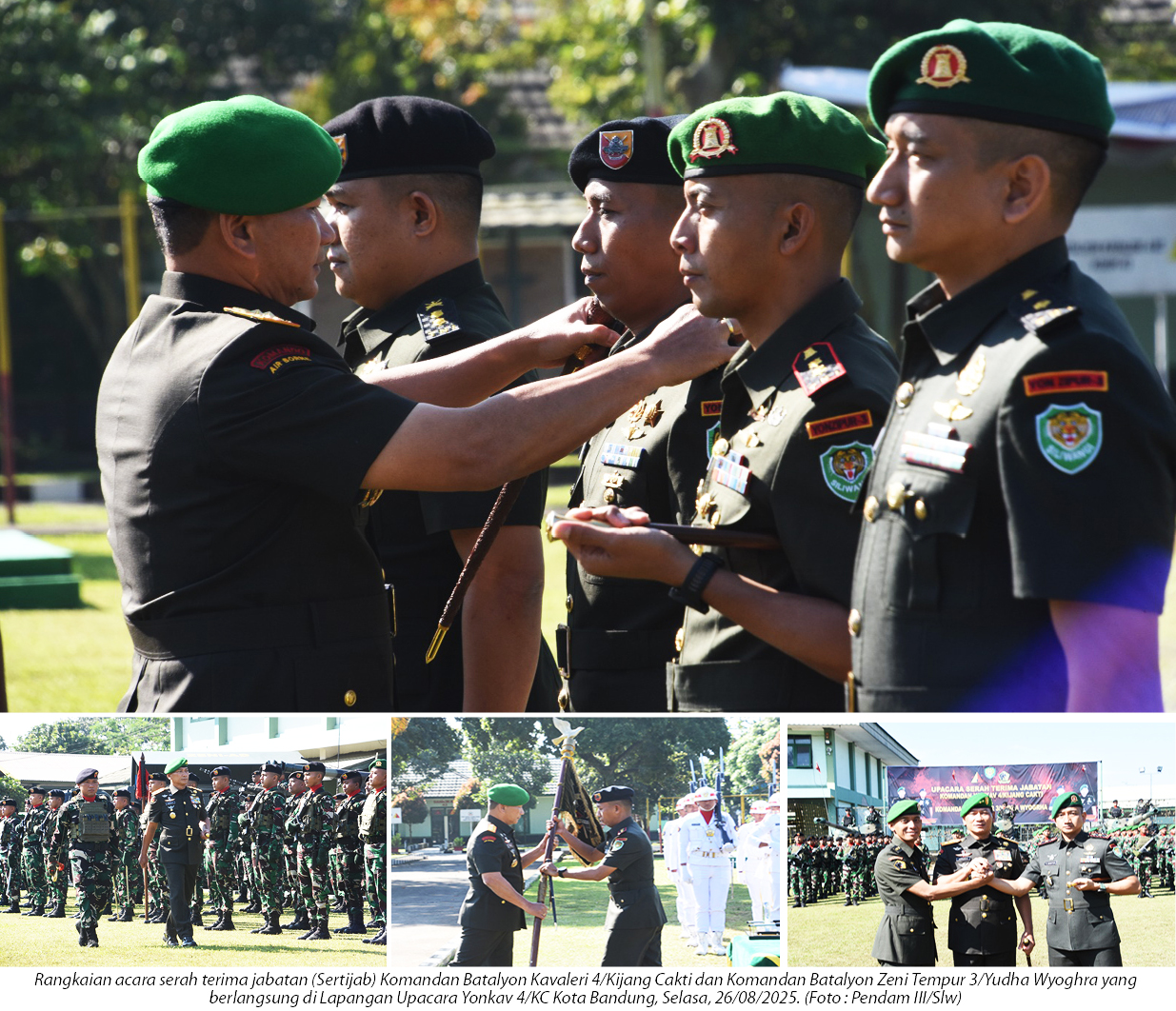 destinasiaNews – Pangdam III/Siliwangi Mayjen TNI Kosasih, S.E., memimpin upacara serah terima jabatan (Sertijab) Komandan Batalyon Kavaleri 4/Kijang Cakti dan Komandan Batalyon Zeni Tempur 3/Yudha Wyoghra yang berlangsung di Lapangan Upacara Yonkav 4/KC Kota Bandung, Selasa (26/08/2025).