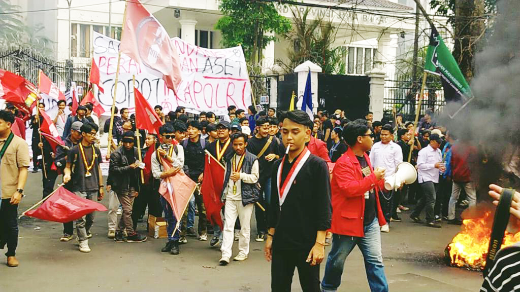 Aksi yang dimulai sekitar pukul 13.56 WIB ini menuntut penegakan hukum yang adil, pemberantasan korupsi, dan pencopotan Kapolri.
