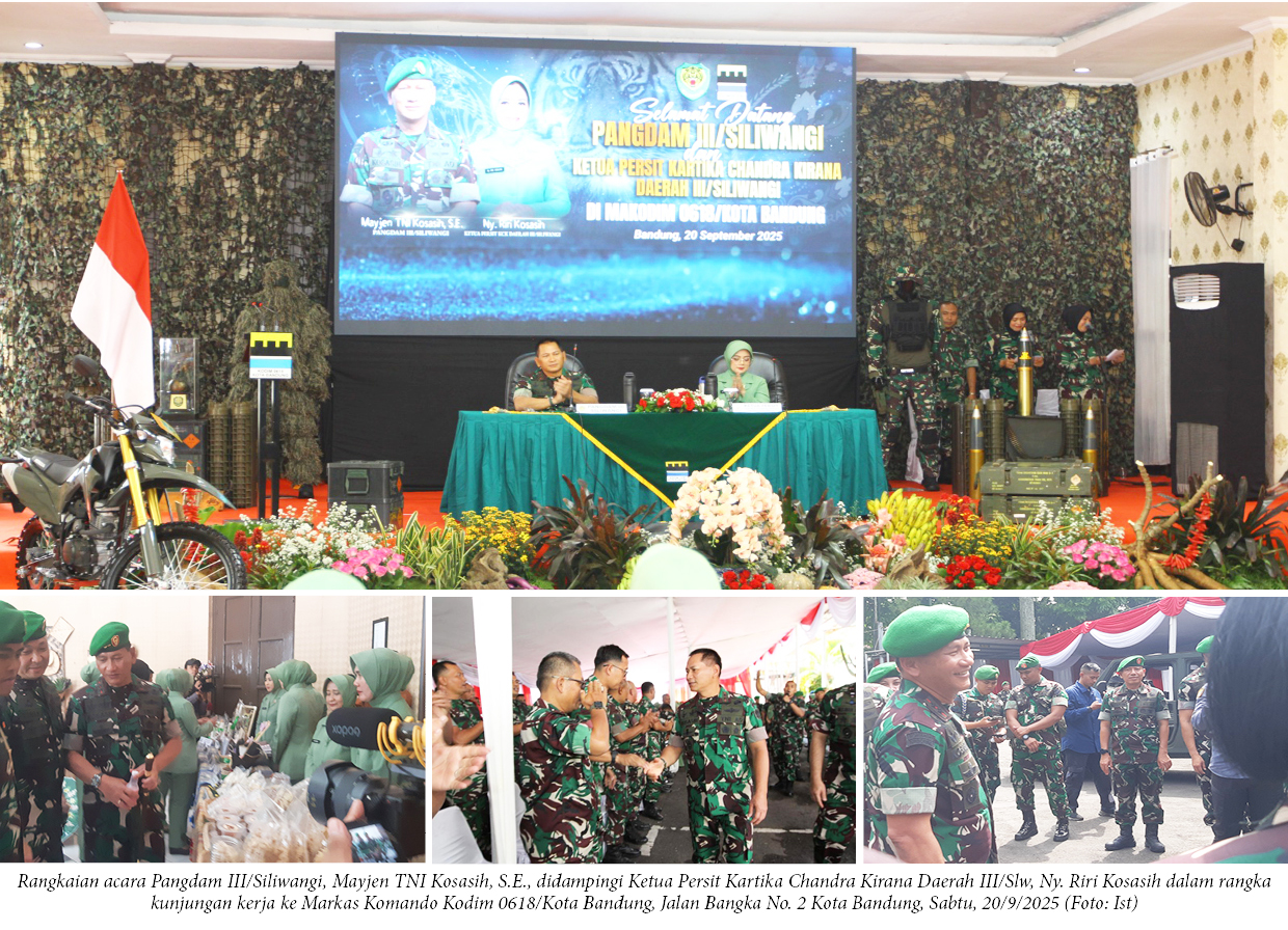 destinasiaNews – Pangdam III/Siliwangi, Mayjen TNI Kosasih, S.E., didampingi oleh Ketua Persit Kartika Chandra Kirana Daerah III/Slw, Ny. Riri Kosasih, melaksanakan kunjungan kerja ke Kodim 0618/Kota Bandung Jl. Bangka No. 2, Kota Bandung. Sabtu, (20/09/2025) dan dihadiri oleh Kasdam III/Slw, Irdam III/Slw, Kapoksahli Pangdam III/Slw, serta para Asisten Kasdam III/Slw, Pa Lo TNI AL, dan TNI AU.