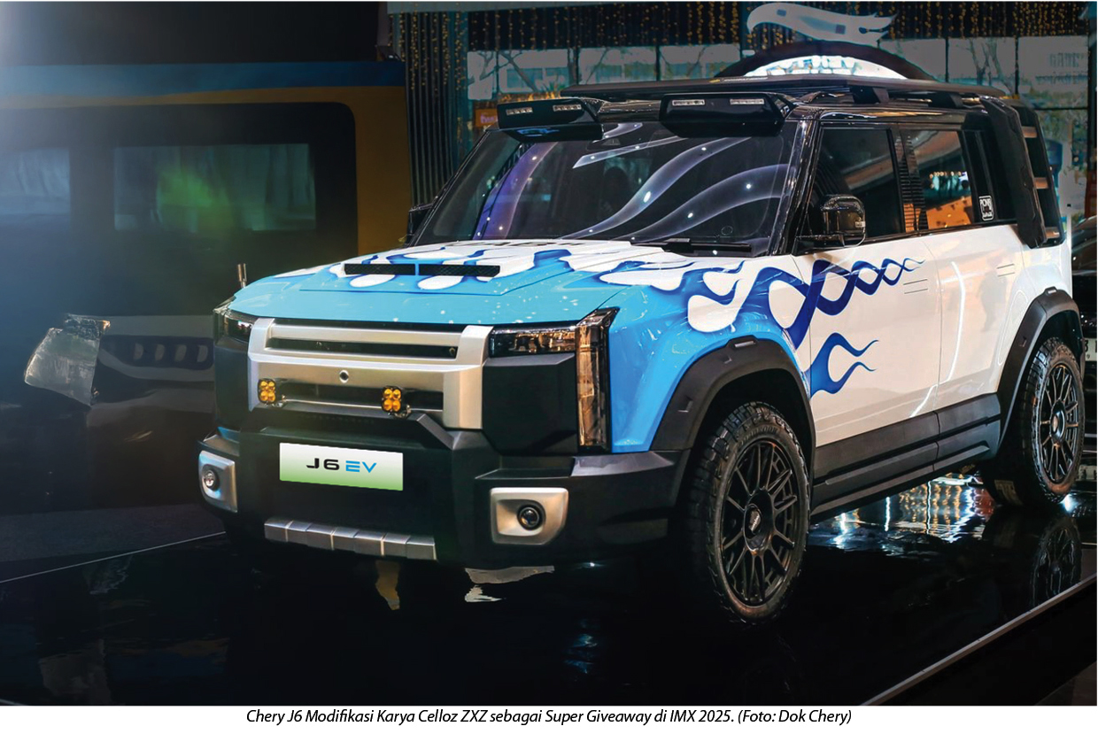 Keikutsertaan pada ajang IMX 2025 pun menjadi momentum penting bagi Chery untuk berinteraksi lebih dekat dengan para penggemar otomotif dan modifikator Tanah Air. Berlokasi di booth A2 dengan luas 170 meter persegi di Hall 9 ICE BSD, Chery menampilkan Chery C5, Chery TIGGO 8 CSH, dan Chery J6 EV sebagai model SUV unggulan. Tidak hanya menghadirkan lini produk terkini, Chery juga mempersembahkan Chery J6 modifikasi yang digarap langsung oleh Cellos ZXZ bersama tim National Modificator & Aftermarket Association (NMAA). Kehadiran unit modifikasi ini menjadi daya tarik utama dalam program Supergiveaway On The Spot IMX 2025, sekaligus memperkuat komitmen Chery dalam mendukung kreativitas masyarakat Indonesia serta ekosistem modifikasi otomotif nasional.