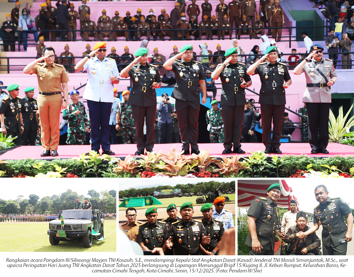 destinasiaNews — Pangdam III/Siliwangi Mayjen TNI Kosasih, S.E., mendampingi Kepala Staf Angkatan Darat (Kasad) Jenderal TNI Maruli Simanjuntak, M.Sc., yang bertindak selaku Inspektur Upacara pada Upacara Peringatan Hari Juang TNI Angkatan Darat Tahun 2025 yang digelar di Lapangan Manunggal Brigif 15/Kujang II, Jl. Kebun Rumput, Kelurahan Baros, Kecamatan Cimahi Tengah, Kota Cimahi, Senin (15/12/2025).